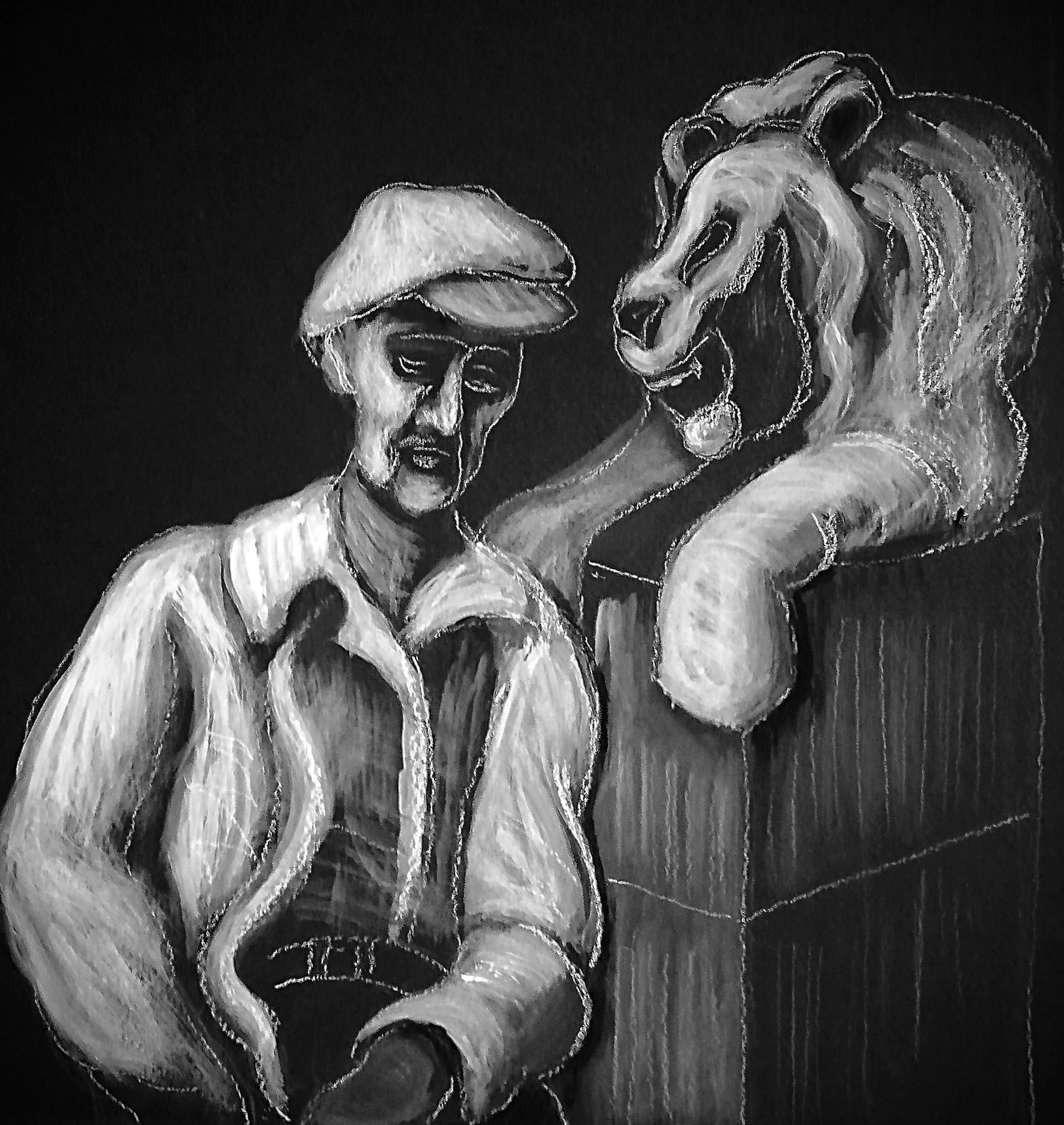 Old Man with Lion Statue gouache 10 in. x 10 in.